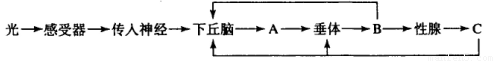 (2)上面图解中的A、B、C分别代表由下丘脑、垂体和性腺分泌的物质,则它们分别是                 、                          。C进入血液后,通过_____________作用来调节下丘脑和垂体中激素的合成和分泌。