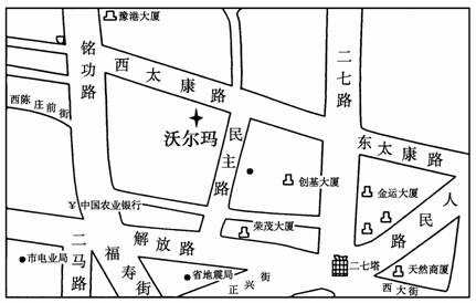 2009年9月1日,全球零售业老大沃尔玛在郑州的第二家店(紧邻郑州市商业中心二七广场)开门迎客。读沃尔玛二七店位置示意图,回答以下题。