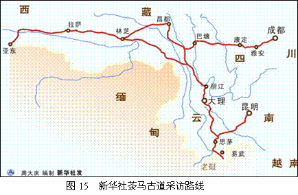 材料二:茶马古道是一个非常特殊的地域称谓,是指存在于中国西南地区,以马帮为主要交通工具的民间商贸通道。它既是中国西南民族经济文化交流的走廊,也是一条世界上自然风光最壮观,文化最为神秘的旅游绝品线路,蕴藏着开发不尽的文化遗产。2005年秋季,新华社组织部分记者分别沿滇藏和川藏两条线路进入西藏,对茶马古道进行调研采访,图15为采访路线图。