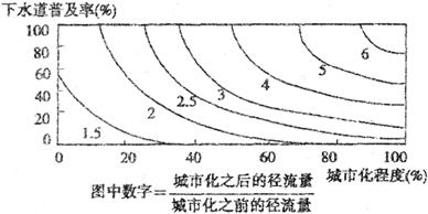 城市化进程大幅度改变了原有的水文生态。专家在进行城市化、下水道普及率以及径流量的相关分析研究时,将三者之间的关系进行了归纳,如图所示。读图回答18~20题。