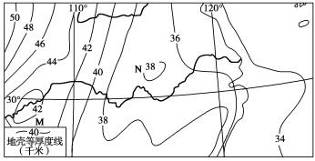 读“我国大陆部分地壳等厚度线图”,完成3~4题。