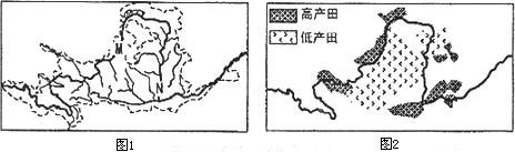 图1是我国某河流域水系图,图2是该河上中游地区农田类型分布图。读图回答问题。