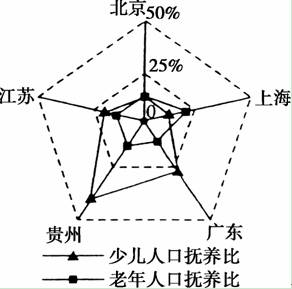 A.江苏的少儿人口抚养比大于北京 B.上海的老年人口抚养比小于广东
