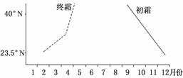 我国某中学地理研究性学习小组对霜冻现象进行探究性学习。下图是他们通过长期收听天气预报绘制的我国东部地区的平均初霜、终霜日期曲线图。据此完成: