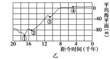 “仙女木”是寒冷气候的标志性植物,因此用来命名出现在北欧的寒冷事件,“新仙女木”表示末次冰期的最后一次寒冷事件。“新仙女木”事件之后气候变暖,进入温暖的全新世界。下列甲图是“地球50万年前至今的气温变化模拟曲线图”,乙图是“地球2万年前至今的海平面模拟变化图”。读图回答4~5题。