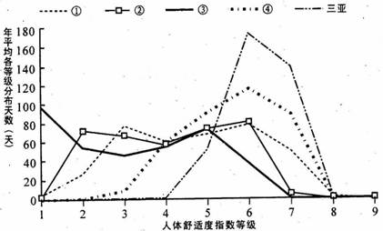 6.在五个城市中,三亚最舒适天数最少,其主要影响因素是