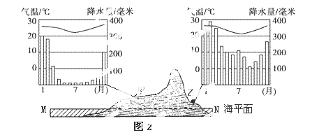 材料二:图2是图1中M到N的地形剖面示意图及甲、乙两地气温、降水统计图。![]()