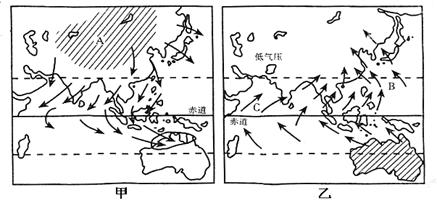 ⑴在甲、乙两图中,表示亚洲一月季风图的是 图,此时为南半球 季。