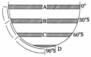 ⑶在图中相应的位置上添画箭头表示三个风带的风向,并标注风带名称。(6分)