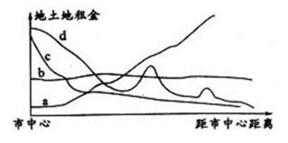 24.图中能正确表示城市从市中心到外缘地租水平变化趋势的曲线是