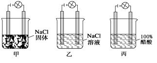 某化学兴趣小组在实验室进行化学实验,按照图甲、乙、丙连接好线路,发现甲灯泡不亮,乙灯泡亮,丙灯泡不亮。由此得出的结论正确的是 ( )![]()