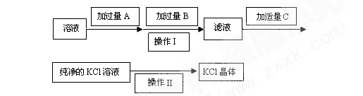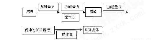 (14分)为了除去KCl溶液中少量的MgCl2、MgSO4,可选用Ba(OH)2、HCl和K2CO3三种试剂,按如下步骤操作:![]()