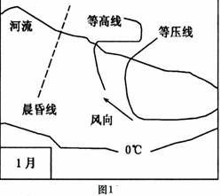 读“中纬度某地某日河流、晨昏线、风向、等值线的组合图”(图1)回答下列1-2题.