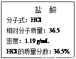 | 盐酸 分子式:HCl 相对分子质量:36.5 密度:1.19g/mL HCl的质量分数:36.5%(1)该浓盐酸中HCl的物质的量浓度为 11.9mol/L 11.9mol/L .(2)取用任意体积的该盐酸溶液时,下列物理量中不随所取体积的多少而变化的是 BD BD (填编号).A.溶液中HCl的物质的量B.溶液的浓度C.溶液中Cl-的数目D.溶液的密度 (3)某学生欲用上述浓盐酸和蒸馏水配制500mL物质的量浓度为0.400mol/L的稀盐酸.该该学生需要量取 16.8 16.8 mL(小数点后保留一位)上述浓盐酸进行配制.②现有a.10mL量筒;b.25mL量筒;c.烧杯;d.托盘天平.e.500mL容量瓶;f.胶头滴管;g.玻璃棒,请从其中选取必要的仪器,按各仪器第一次使用先后顺序排序: bcgef或bfcge bcgef或bfcge (填编号).③在配制过程中,下列实验操作对所配制盐酸物质的量浓度有何影响?(在空格中填“偏高”、“偏低”或“无影响”):定容时俯视观察 偏高 偏高 ;定容后经振荡、摇匀、静置后,发现液面下降,再加适量的蒸馏水偏低 偏低 .