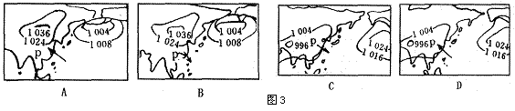 如图3所示,能正确表示7月份亚欧大陆与太平洋气压分布及P地风向的是 ( )