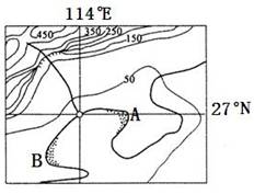 读下列两图(图4:我国某地等高线图:图5:我国某地七月等温线分布图),分析回答8~10题。![]()