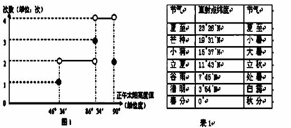 图1为北半球某地一年内正午太阳高度不同值出现的频次图(实线和黑点代表实际存在),表1为我国夏半年各节气太阳直射点的纬度值。读图1和表1,回答问问题。![]()