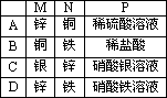 下图所示装置中, 观察到电流计指针偏转,M棒变粗,N棒变细,由此判断右表中所列M、N、P物质, 其中可以成立的是
