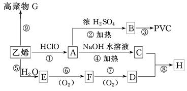 工业上用乙烯和氯气为原料合成聚氯乙烯(PVC)。已知次氯酸能跟乙烯发生加成反应:CH2=CH2+HOCl→CH2(OH)CH2Cl。以乙烯为原料制取PVC等产品的转化关系如下图所示。