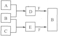 A、B、C是三种常见短周期元素的单质。常温下D为无色液体,E是一种常见的温室气体,F是由两种短周期元素构成的离子化合物,其转化关系如图 (反应条件和部分产物略去)。试回答: