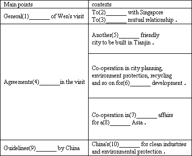 Premier Wen Jiabao and Singapore Prime Minister Lee Hsien Loong agreed to jointly develop an environmentally friendly city in northeastern China.The city will be a model for sustainable development, a Singapore government statement said.The“Sino-Singapore Tianjin Eco-city”will be developed by a joint venture formed by Chinese and Singapore companies.“This eco-city, to be built in Tianjin, will become another highlight in our relations,”When said after signing an agreement with Lee, who agreed,“On the Singapore side, on all levels, we'll give this project our full support.”