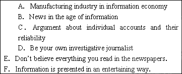 A. Manufacturing industry in information economy B. News in the age of information C. Argument about individual accounts and their reliability D. Be your own investigative journalist E. Don’t believe everything you read in the newspapers. F. Information is presented in an entertaining way. |
