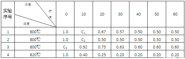 B(g) + D(g) 在4种不同条件下进行,B和D的起始浓度为0 ,反应物A 的浓度(mol?L-1) 随反应时间 (min) 的变化情况如下表:![]()