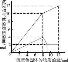Fe2+、Mg2+、Cu2+、NH4+、Al3+.当加入一种淡黄色固体并加热时,有刺激性气体放出和白色沉淀生成,加入淡黄色固体的物质的量(横坐标)与析出的沉淀和产生气体的物质的量(纵坐标)的关系如图所示.由此可知溶液中含有的离子是________,所含离子的物质的量浓度之比为________,所加的淡黄色固体是________.25℃时,在含有大量Ba2+的某澄清透明溶液中,由水电离产生的OH-物质的量浓度为1×10-12mol/L,则在此溶液中还可能大量共存的离子组有