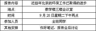 10月4日,高二年级一班和二班之间将进行一次有关环保问题的演讲比赛(a talk show on environment protection)。此前,二班邀请清华大学的Dr. Li作相关内容的报告。假定你是二班的班长,请你草拟一个有关报告会的口头通知。