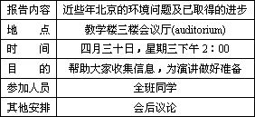 五月四日,高三年级一班和二班之间将进行一次有关环保问题的演讲比赛(a talk show on environment protection)。在这之前,二班将邀请清华大学的Dr Li做相关内容的报告。