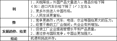中国2001年底加入了世界贸易组织(WTO)。请你根据下表提供的信息,谈一谈中国入世的利与弊。