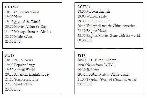 A. CCTV-1        B. NTTV        C. CCTV-4         D. JSTV