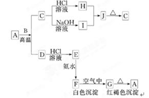 (8分)A是一种红棕色金属氧化物,B、D是金属单质,J是一种难溶于水的白色化合物,受热后容易发生分解.![]()