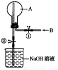 (12分) 如下图所示,在一个烧瓶中充满气体A,打开①处的止水夹向烧瓶中缓慢通入等体积的气体B后关闭该止水夹,待充分反应后再打开②处的止水夹。![]()