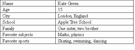 | 假设你在互联网上新结识了一位笔友,请你根据下表所提供的信息向你的同学做一简要介绍。 文段第一句已给出。要求文段意思连贯,符合逻辑,书写工整,下表所提供提示必须都用上。 (50个词以内)
