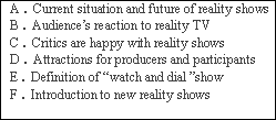 “Big Brother” was probably the fist of the new reality shows, but such a programme has developed.Many have found appeal by having a theme to them, but most are based on the principle of “survival of the fittest”by eliminating participants as the series progresses.So we have the dating shows where winners either pair off or stay true to their partners outside the TV studio.Then there are those that test people’s abilities for specific jobs like running a kitchen, becoming an interior designer or a top model.