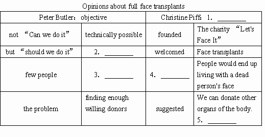 Full face transplants(移植) are no longer science fiction fantasy, a leading surgeon has said, adding that they are technically possible but ethically(伦理上) complex. Peter Butler from London's Royal Free Hospital called for a debate on the ethics of such an operation made possible by new drugs which stop the body's immune(免疫) system rejecting a transplanted face. “It is not ‘Can we do it’ but ‘Should we do it’”, he told the BBC. “The technical part is not complex, but I don't think that's going to be the very great difficulty... The ethical and moral debate is obviously going to have to take place before the first facial transplantation.” The British Association of Plastic Surgeons(外科) will discuss the microsurgical procedure, which could give new skin, bone, nose, chin, lips and ears from dead donors(捐赠者) to patients disfigured by accidents, burns or cancer. But surgeons could have trouble finding enough willing donors. Butler said his survey of doctors, nurses and members of the public showed most would accept a face transplant but few were willing to donate their own after dying. Despite a number of ethical concerns, Christine Piff, who founded the charity ‘Let's Face It’ after suffering a rare facial cancer 25 years ago, welcomed the possibility of face transplants. She rejected the idea that the procedure would mean people would end up living with a dead person's face. “There are so many people without faces, I have half a face… but we are all so much more than just a face… you don't take on their personality. You are still you,” she told the reporters. “If we can donate other organs of the body then why not the face. I can't see anything wrong with it.”