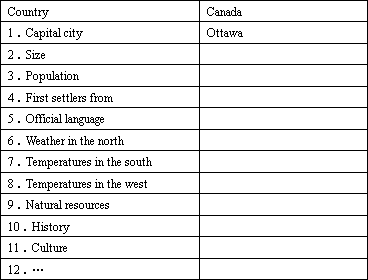 The first and second groups try to get more knowledge about Canada by surfing the internet or looking through some related books.Each group finishes half of the diagram.Make a competition and see which group does better or more quickly.