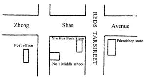 你的同学Black是第一中学的新生,该校位于邮电局的对面,Black要到新华书店买本字典
