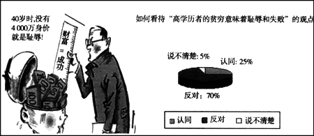 书面表达,某大学教授称,高学历者的贫穷意味着耻辱和失败,并对大学生提出要求:“当你40岁时,没有4, 000万身价不要来见我,也别说是我的学生。”对此,凤凰网进行了调查。多数人持反对态度,认为教师不应用金钱来衡量学生;有少数人则认为这是一种激励;还有极少数人说不清楚。请你根据漫画并结合饼状图(pie chart)用英语写一篇短文。