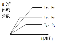 qC(g)在密闭容器中进行。如图所示反应在不同时间t,温度T和压强P与反应物B的体积分数的关系曲线。根据图象填空![]()