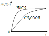①CH3COOH溶液、②HSCN溶液、③NaHCO3溶液,已知将①、②分别与③混合,实验测得产生的CO2气体体积[(v)随时间(t)变化的示意图所示,![]()