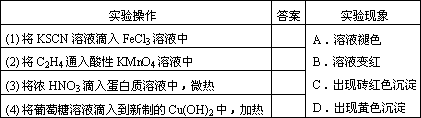| (1) 将KSCN溶液滴入FeCl3溶液中 | A.溶液褪色 B.溶液变红 C.出现砖红色沉淀 D.出现黄色沉淀 | |