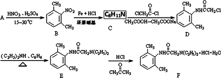 (14分)盐酸利多卡因(F)葡萄糖注射液抗心律失常,可用于急性心肌梗死后室性早搏和室性心动过速。合成路线流程图如下:![]()
