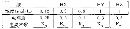 | C.等物质的量浓度的NaX、NaY和NaZ的混合溶液,则c(Z-)<c(Y-)<c(X-) | ||