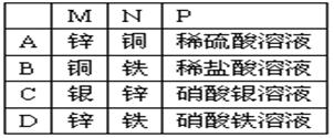 下图所示装置中观察到电流计指针偏转,M棒变粗,N棒变细,指针指向M,由此判断下表中所列M、N、P物质,其中可以成立的是 ( )