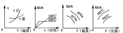 A2(g)+3B2(g) ΔH>0 (图中AB3%为体系中AB3的体积百分含量,v为反应速率)。关于该可逆反应的下列图象不正确的是![]()