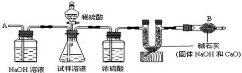 ①按图组装仪器,并检查装置的气密性②将a g试样放入锥形瓶中,加适量蒸馏水溶解,得到试样溶液;③称量盛有碱石灰的U形管的质量为b g;④从分液漏斗中滴入6mol/L的稀硫酸,直到不再产生气体为止,⑤从导管A处缓缓鼓入一定量的空气;⑥再次称量盛有碱石灰的U形管的质量为c g;⑦重复⑤和⑥的操作,直到U形管的质量基本不变,测得质量为d g。