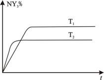 2NY3(g)。温度分别为T1和T2时,NY3的体积分数随时间变化如下图,该反应的△H 0(填“>”“<”或“=”);若T1、T2时反应的化学平衡常数分别为K1、K2,则K1 K2(填“>”“<”或“=”)。