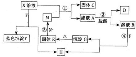 (10分)已知X为中学化学中一种常见的盐,F为淡黄色固体;M、N为常见的金属,N的氧化物可作耐火材料,可用它来制造耐火坩埚和耐高温试验仪器;H为气体单质,D为无色气体,D在空气中会出现红棕色,各物质的转化关系如下图,(部分反应产物已略去).![]()